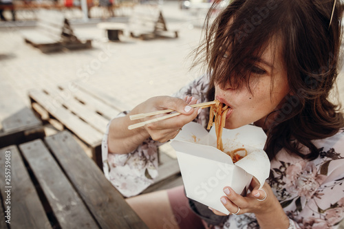 Stylish Hipster Girl Eating Wok Noodles With Vegetables From