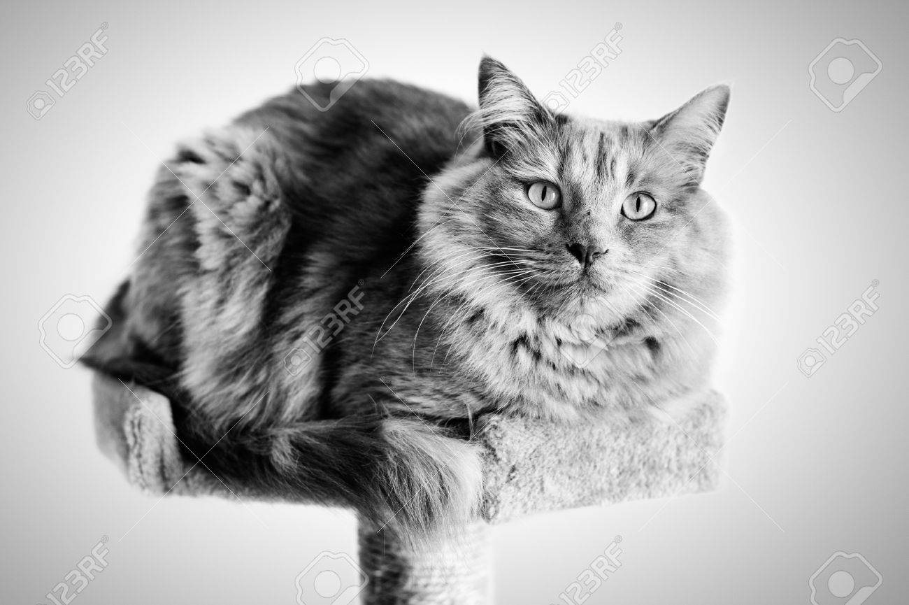 Cat Sitting On The Scratching Post Black And White In A Gray